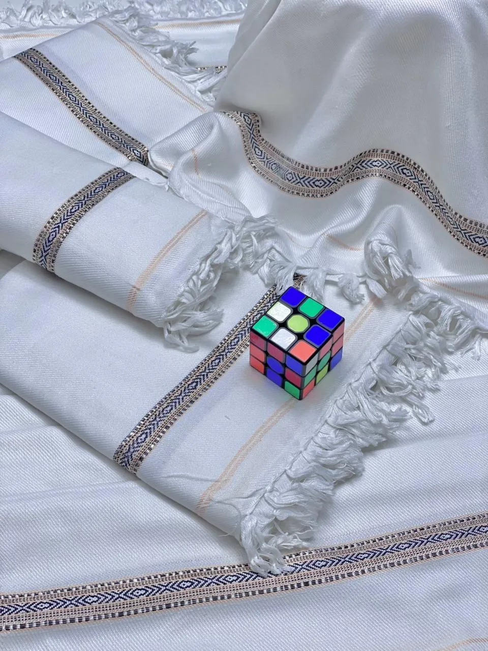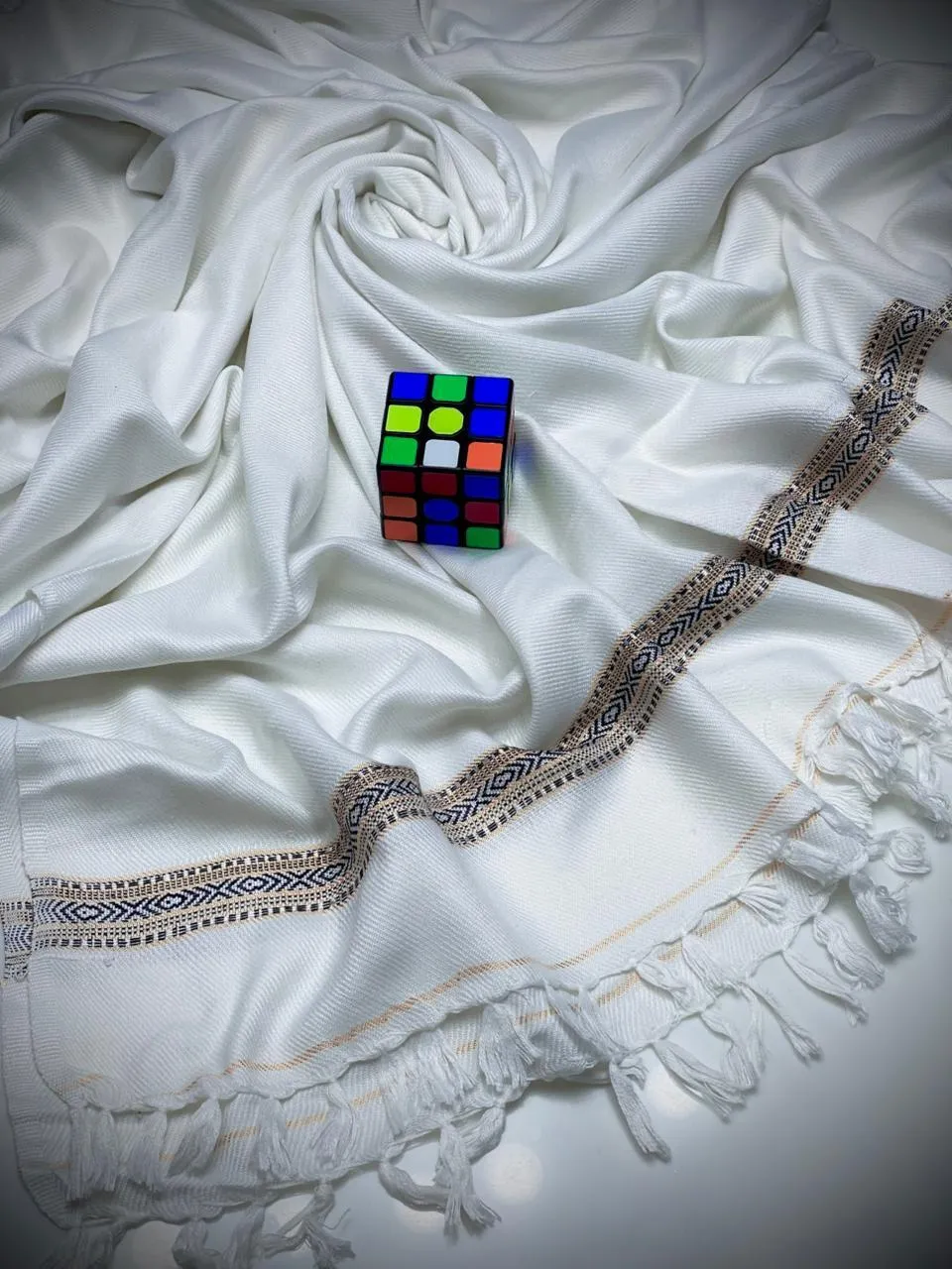 • Fabric: Pashmina Wool• Pattern: Zari• Number Of Pieces: 1 Pc• Color: White• Package Includes: 1 x Shawl• Size Dimensions: 2.75 Meter• Supplier Helpline 03072387067• Note: There might be an error of 1-3 cm due to manual measurement, and slight color differences may occur as a result of varying lighting and monitor effects.
