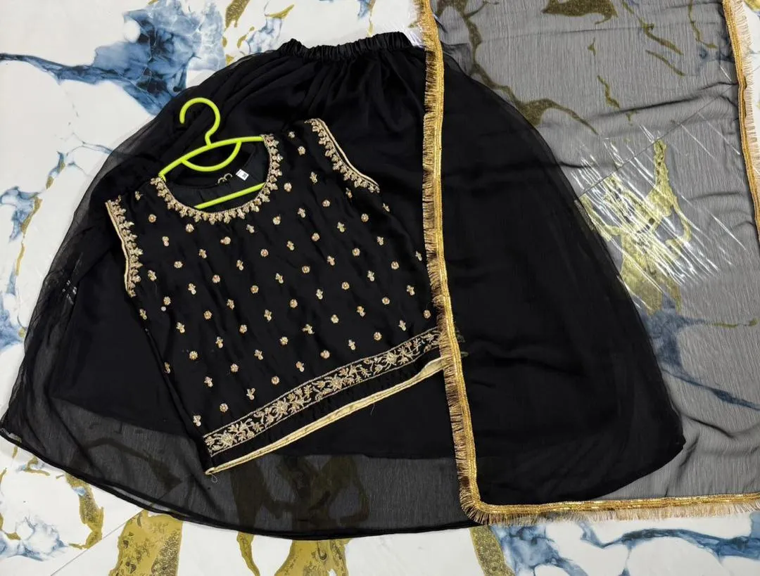 • Material: Chiffon• Pattern: Embroidered• Gender: Girl’s• Preferred Ages: 1-12 Years• Available Sizes: 5-6 Years, 7-8 Years, 8-10 Years, 11-12 Years• Number Of Pieces: 3 Pcs• Package Includes: 1 x Shirt, 1 x Skirt, 1 x Dupatta• Shirt Length: 14 Inches• Chest: 17 Inches• Shoulder: 14 Inches• Arm Length Size: 12 Inches• Trouser Length: 33 Inches• Dupatta: 1.5 Gazz• Color: Black• (30 Size 6-8 Years)• Top Chest Size 15• Top length 12• Skirt Length 29• Skirt Ghair 80• (32 Size 8-10 Year)• Top Chest Size 16• Top length 13• Skirt Length 31• Ghair 80• (34 Size 10-12 Years)• Top Chest Size 17• Top Length 14• Skirt length 33• Stuff Silk (Premium Silk)• Dupatta Size 1.5 Yards• Stuff CHIFFON• Note: There might be an error of 1-3 cm due to manual measurement, and slight color differences may occur as a result of varying lighting and monitor effects.• Product Code: MZ1995200167GYKSCN