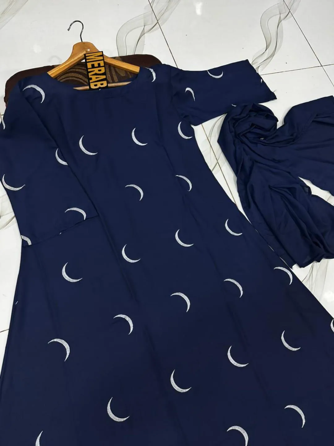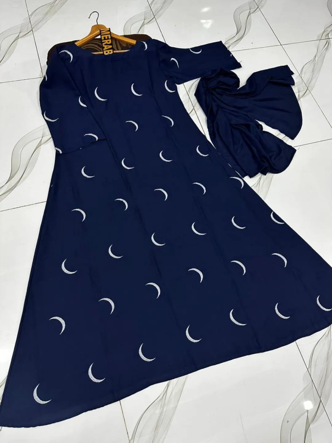 • Material: Georgette• Pattern: Embroidered• Gender: Women’s• Product Feature: Comes With Stoller• Neck Type: Round Neck• Color: Blue• Package Includes: 1 x Full Abaya• Length: 54 Inches• Width: 27 Inches• Height: 5.5 Inches• Front Moon ?? Embroidered Abaya with Stoller 2Pcs• Size Measurement• Abaya Chest Size 22/23• Abaya Length 53/54• Sleeves Length 17/18• Stuff Double Goergette• (Imported Goergette)• Same Colour Plain Stoller• Size Standard• Length 60• Width 26/27• Stuff Double Goergette• Note: There might be an error of 1-3 cm due to manual measurement, and slight color differences may occur as a result of varying lighting and monitor effects.