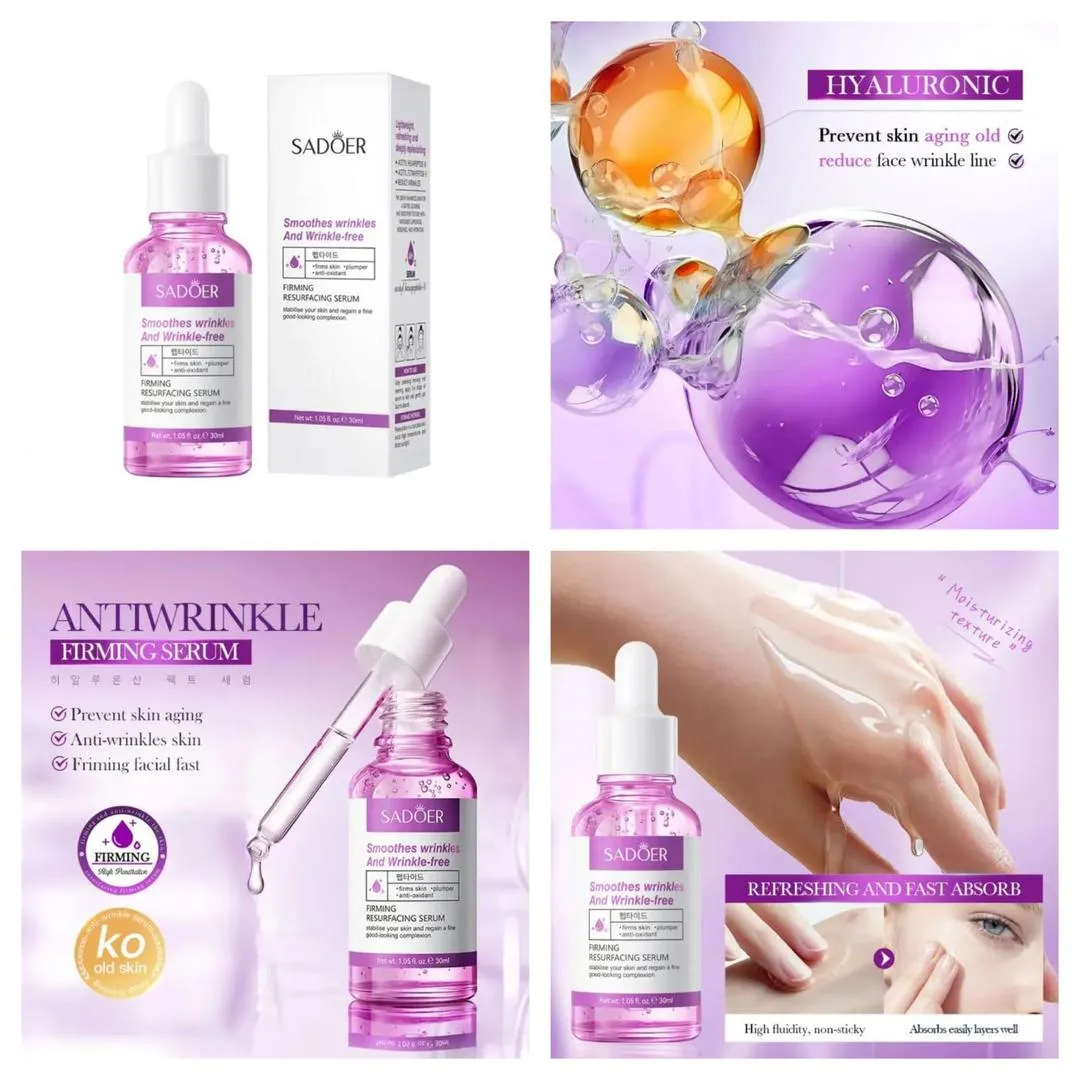 • Material: Liquid• Texture: Smooth• Color: White• Product Feature: Anti-Aging, Hydrating, Even Skin Tone, Prevent Dryness And Dehydration, Absorbent, 4 In 1, Repairs & Nourishes• Package Includes: 1 x Face Serum• SADOER Firming Resurfacing Serum is an advanced anti-aging facial serum formulated with Acetyl Hexapeptide-8 and Hyaluronic Acid to help reduce the appearance of fine lines and wrinkles while deeply hydrating the skin. Its lightweight, fast-absorbing texture improves skin elasticity, smooths rough texture, and enhances overall radiance without leaving a sticky residue. Suitable for all skin types, this peptide-powered formula helps maintain moisture balance and promotes a firmer, refreshed, and youthful-looking complexion with daily use.• Key Features:• Helps reduce the appearance of wrinkles and fine lines• Improves skin firmness and elasticity• Deep hydration with Hyaluronic Acid• Smooth, lightweight, non-greasy formula• Suitable for all skin types• Net Content: 30ml• #SADOER #AntiAgingSerum #PeptideSerum #HyaluronicAcid #FirmingSerum #WrinkleCare #HydratingSerum #SkincareRoutine #SmoothSkin #BeautyCare• Note: Before using any new cosmetic product, perform a patch test on a small skin area. Verify ingredients for allergies and follow package warnings and directions.• Product Code: MZ1996200138ESB
