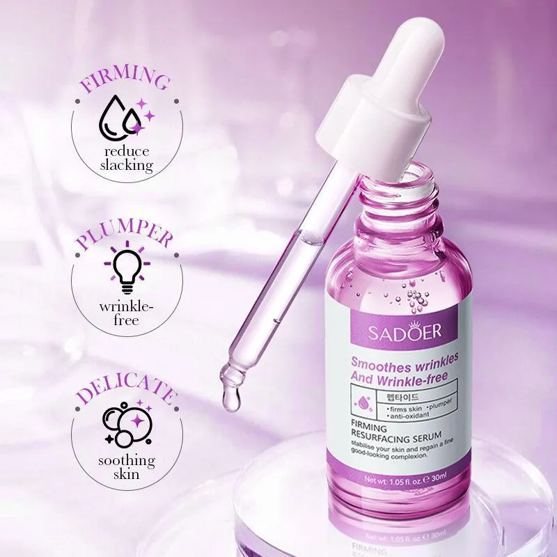 Reveal smoother, firmer, and more youthful-looking skin with SADOER Firming Resurfacing Serum. Formulated with Acetyl Hexapeptide-8 and Hyaluronic Acid, this advanced anti-aging facial serum helps reduce the appearance of fine lines and wrinkles while delivering deep, long-lasting hydration. The lightweight, fast-absorbing formula works to improve skin elasticity, refine uneven texture, and resto